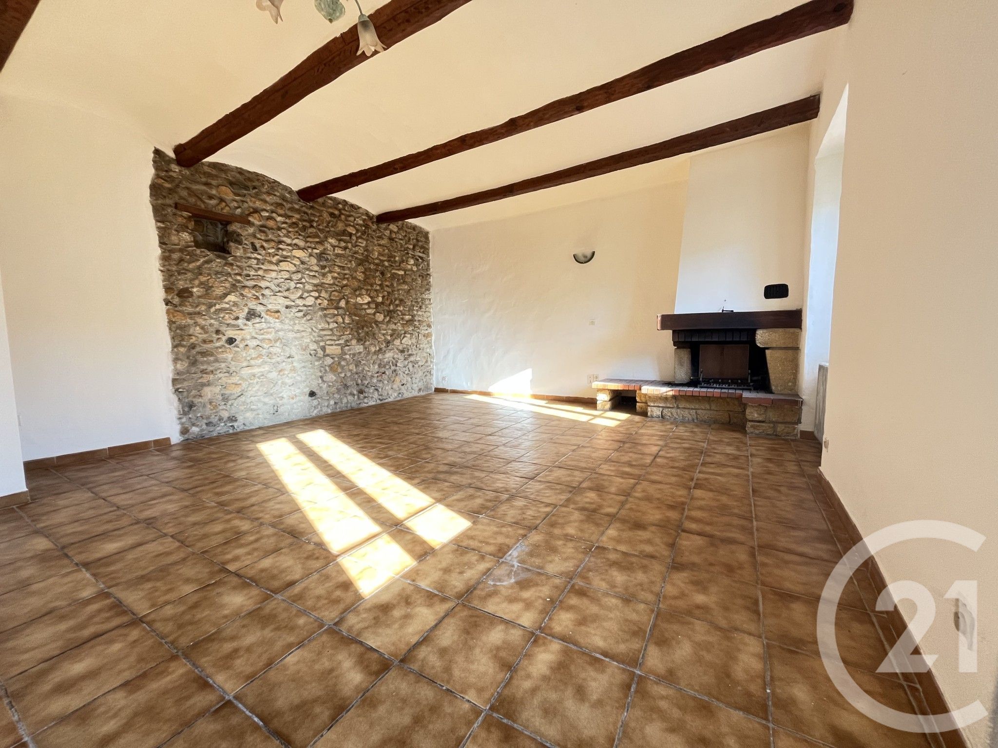 * Une belle pièce de vie de plus de 30 m², salon-séjour lumineux, avec poutres apparentes et murs en pierre, apportant beaucoup de cachet. (cheminée non fonctionnelle) et un WC.